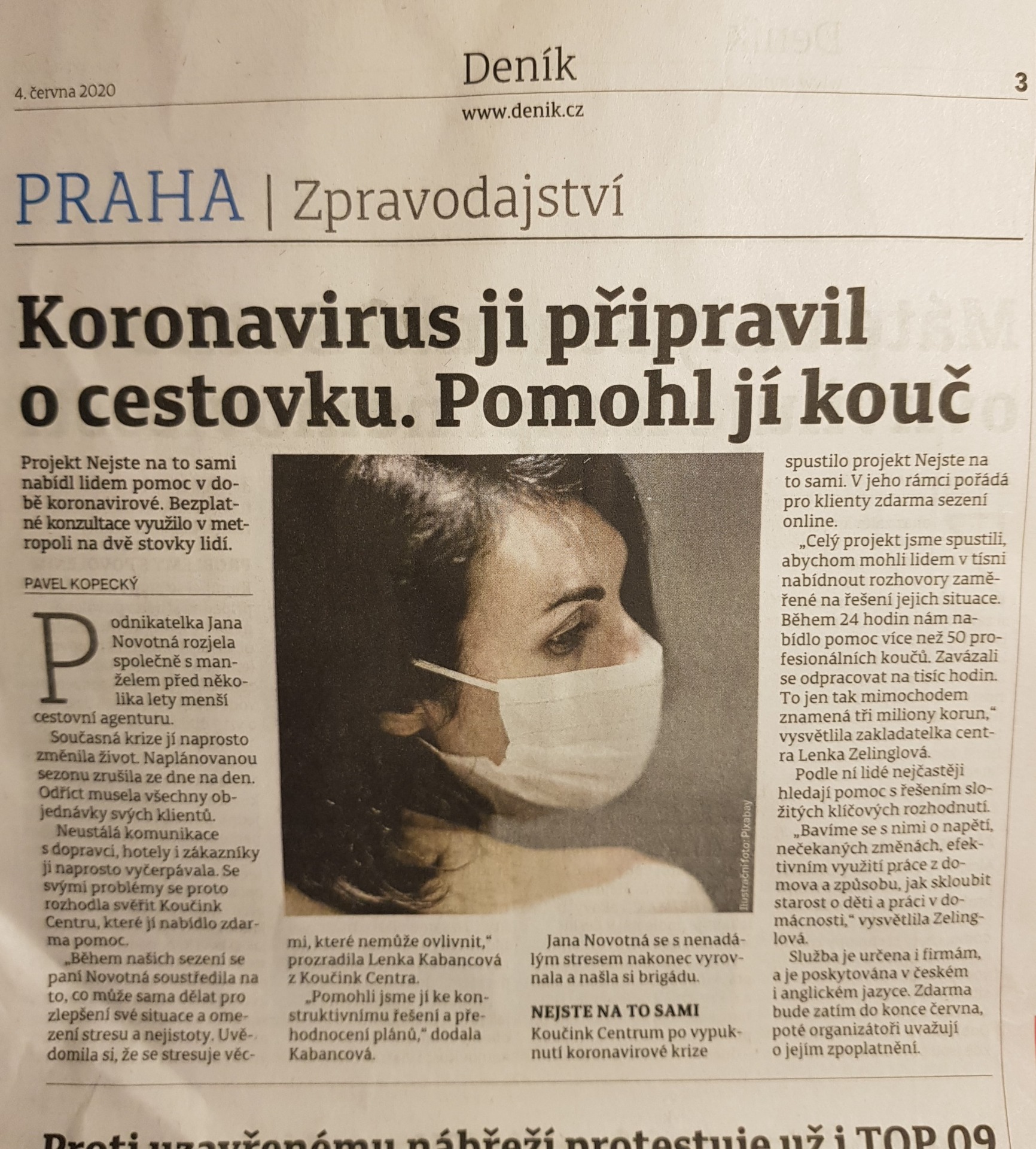 Dne 4. června 2020 Pražský deník otiskl článek o mé klientce a o iniciativě #nejstenatosami. Propuknutí první vlny koronaviru měl pro některé z nás vážné následky. Došlo ke změně způsobu života řady z nás, ať už to bylo kvůli změně zaměstnání, novému způsobu života, strachu, pocitu ztráty svobody či něčemu úplně jinému. Mnozí z nás se museli zastavit a přehodnotit své aktivity, plány a vyhlídky.